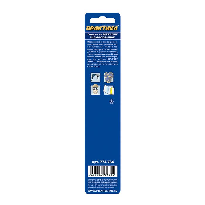 Сверло по металлу удлиненное ПРАКТИКА Р6М5 5.0 х 132 мм (1шт.) блистер (774-764) - цена, фото, технические характеристики