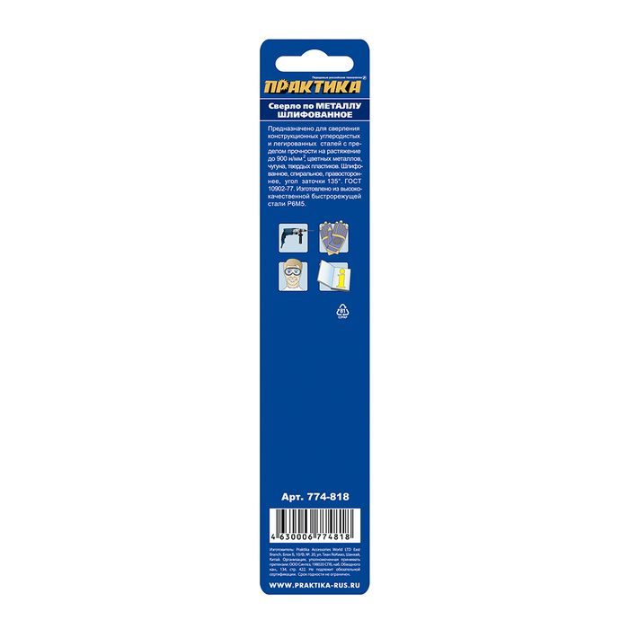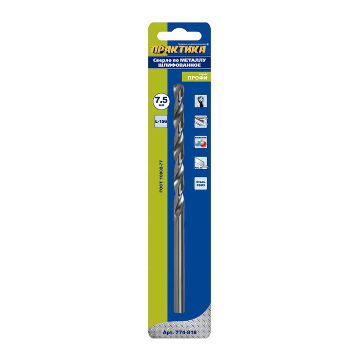 Сверло по металлу удлиненное ПРАКТИКА Р6М5 7,5 х 156 мм (1шт.) блистер (774-818) - цена, фото, технические характеристики