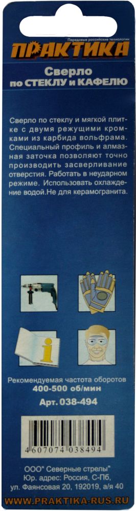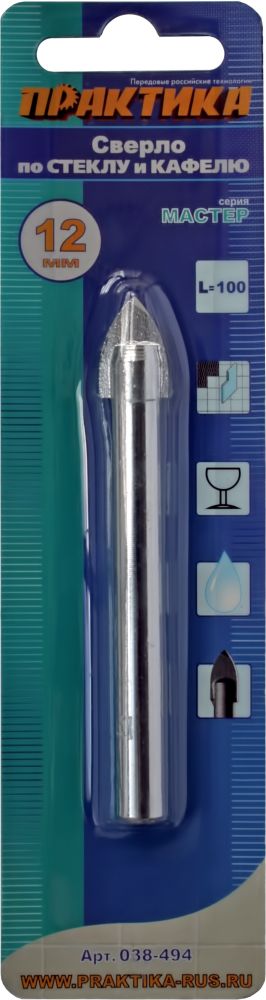 Сверло по стеклу и кафелю ПРАКТИКА "Мастер" 12 х 100 мм (1шт.) блистер (038-494) - цена, фото, технические характеристики