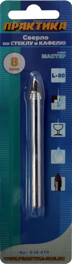 Сверло по стеклу и кафелю ПРАКТИКА "Мастер" 8 х 80 мм (1шт.) блистер (038-470) - цена, фото, технические характеристики