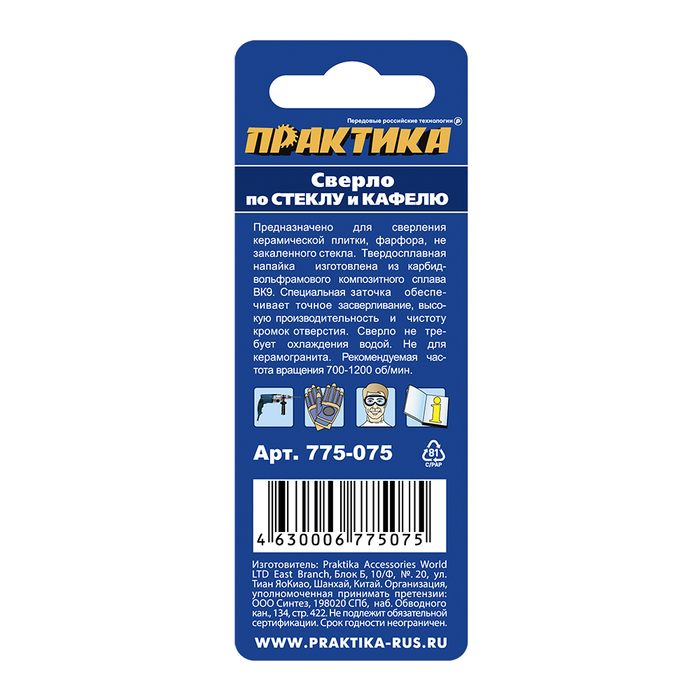 Сверло по стеклу и кафелю ПРАКТИКА "Профи" V-тип 4 х 51 мм (1шт.) блистер - цена, фото, технические характеристики