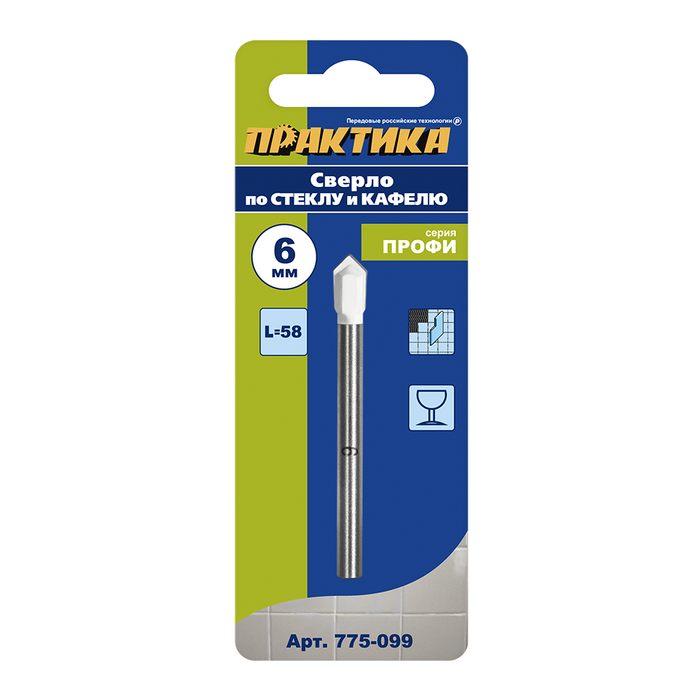 Сверло по стеклу и кафелю ПРАКТИКА "Профи" V-тип 6 х 58 мм (1шт.) блистер - цена, фото, технические характеристики