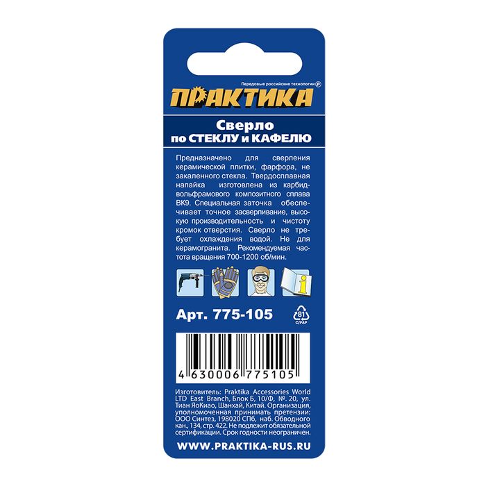 Сверло по стеклу и кафелю ПРАКТИКА "Профи" V-тип 8 х 58 мм (1шт.) блистер - цена, фото, технические характеристики