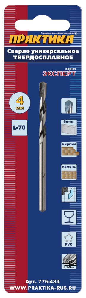 Сверло универсальное ПРАКТИКА твердосплавное 4 х 70 мм (1шт.) блистер, серия Эксперт (775-433) серия Эксперт