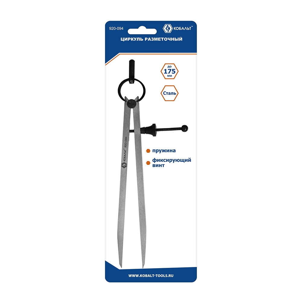 Циркуль разметочный КОБАЛЬТ шир. раскр. до 175 мм, С ПРУЖ. И ФИКС.ВИНТОМ, разметка дер/кож/пласт/мягк.мет.,углер.сталь, блистер (920-094) - цена, фото, технические характеристики