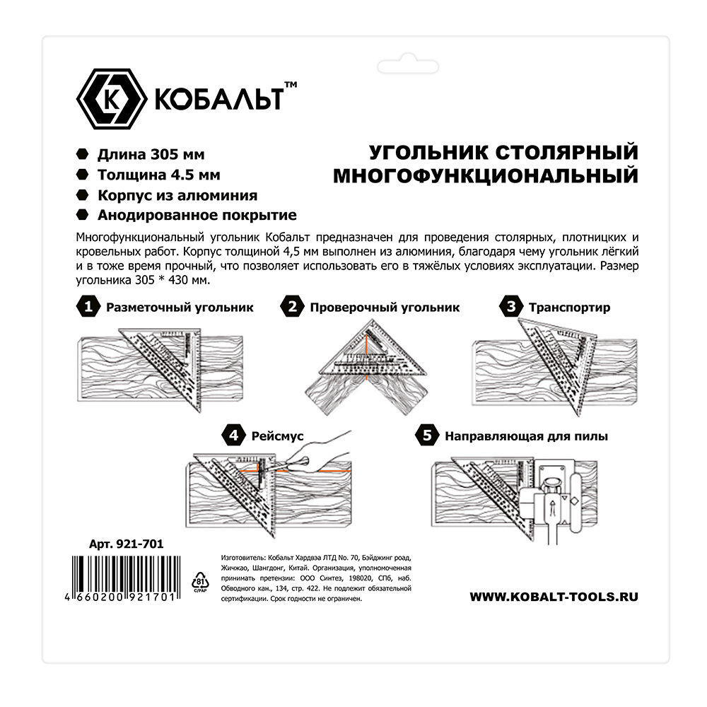 Угольник КОБАЛЬТ столярный многофункциональный, 305 мм, толщина 4,5 мм, алюминиевый, анодированное покр-е, метрическая шкала (921-701) - цена, фото, технические характеристики