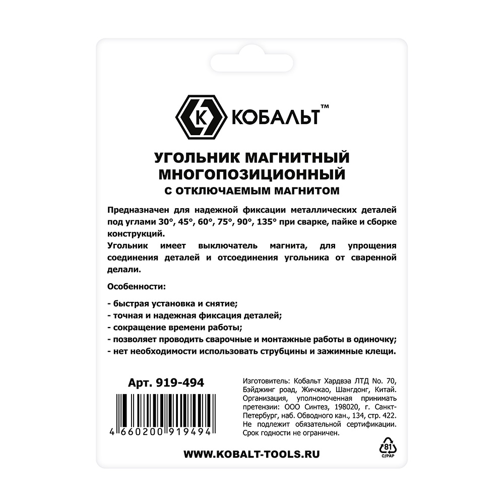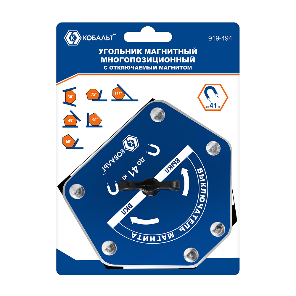 Угольник магнитный КОБАЛЬТ 123 * 103 мм, ОТКЛЮЧАЕМЫЙ МАГНИТ, на 6 углов: 30, 45, 60, 75, 90, 135 град., магнит до 41 кг, блистер (919-494) - цена, фото, технические характеристики