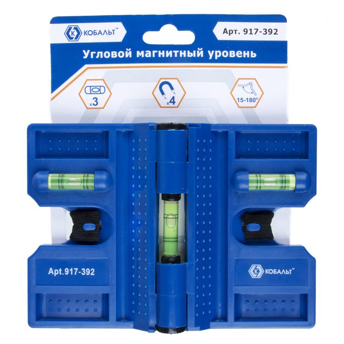 Уровень строительный КОБАЛЬТ угловой, 4 магнита, 3 глазка, точность 0,57 мм/м, пластиковый (917-392) - цена, фото, технические характеристики