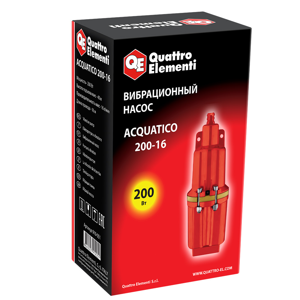 Насос вибрационный QUATTRO ELEMENTI Acquatico 200-16 (200 Вт, 960 л/ч, для чистой, 40м, кабель16 м, верхний забор, 2,7кг) - цена, фото, технические характеристики