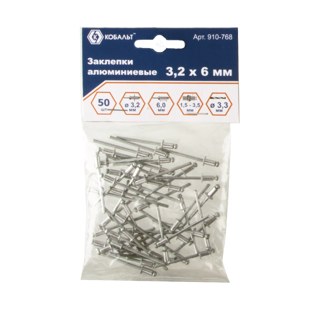 Заклепки вытяжные КОБАЛЬТ алюминиевые, 3,2 х 6 мм (50 шт.) пакет (910-768)