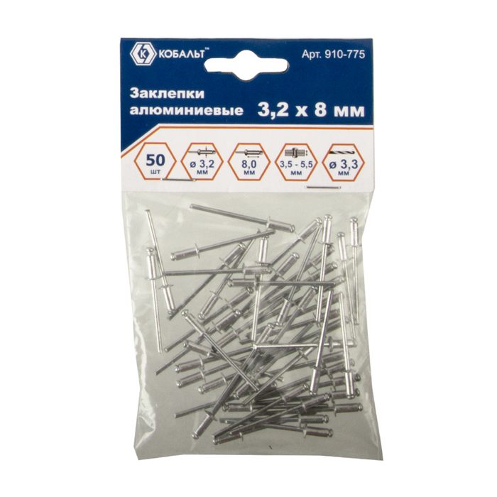 Заклепки вытяжные КОБАЛЬТ алюминиевые 3.2 х 8 мм, 50 шт., пакет с подвесом (910-775) - цена, фото, технические характеристики