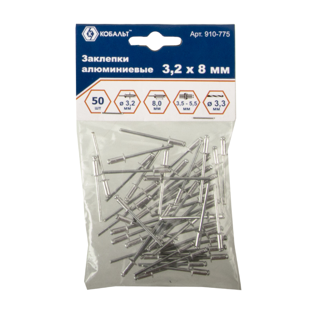 Заклепки вытяжные КОБАЛЬТ алюминиевые, 3,2 х 8 мм (50 шт.) пакет (910-775) - цена, фото, технические характеристики