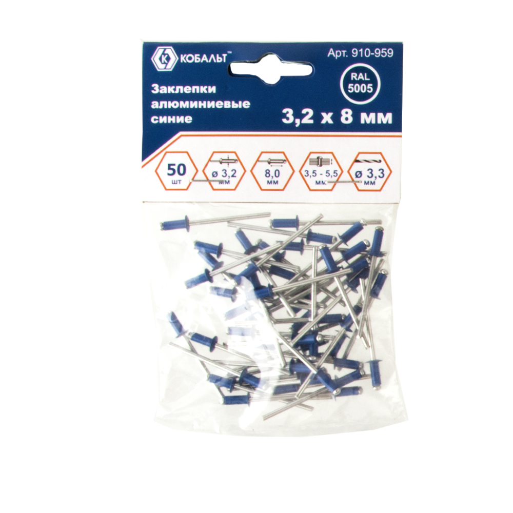 Заклепки вытяжные КОБАЛЬТ алюминиевые, 3,2 х 8 мм, синие RAL 5005 (50 шт.) пакет (910-959)