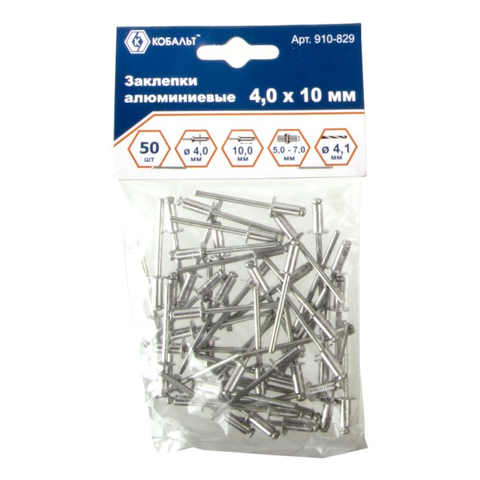 Заклепки вытяжные КОБАЛЬТ алюминиевые 4.0 х 10 мм, 50 шт., пакет с подвесом (910-829) - цена, фото, технические характеристики