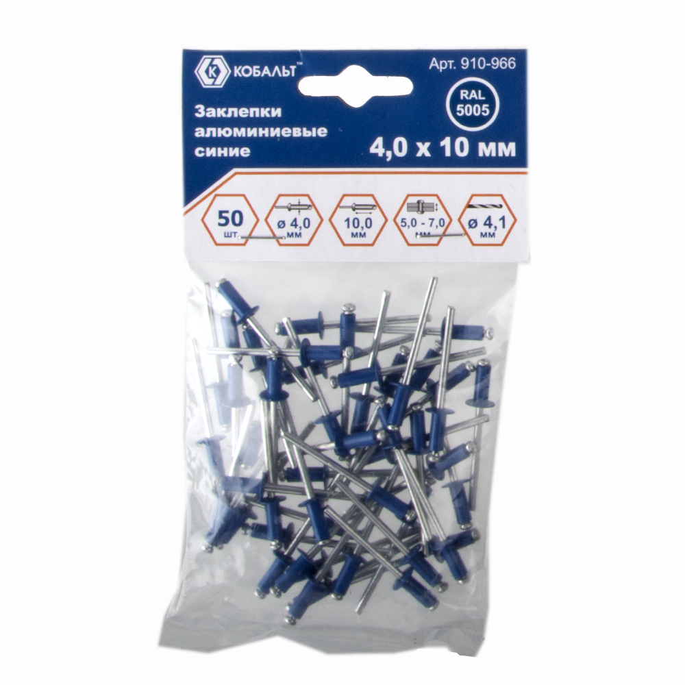 Заклепки вытяжные КОБАЛЬТ алюминиевые, 4,0 х 10 мм, синие RAL 5005 (50 шт.) пакет (910-966) - цена, фото, технические характеристики