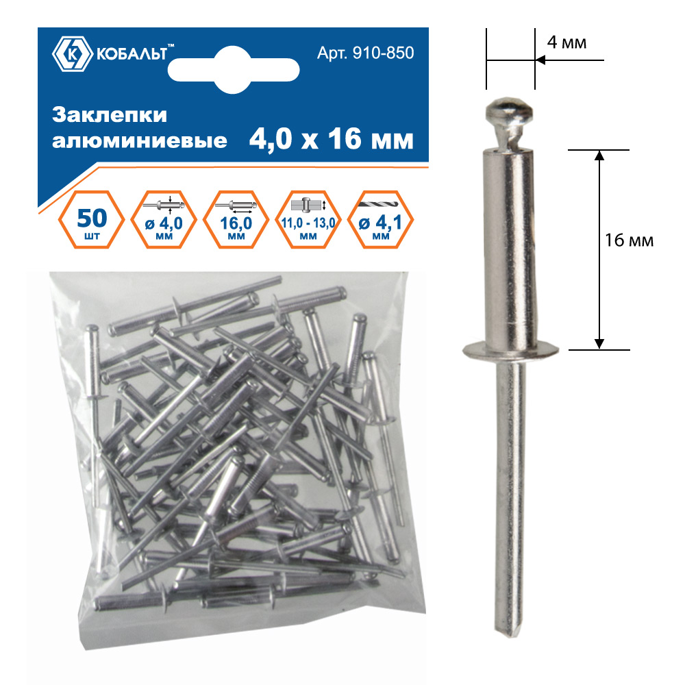 Заклепки вытяжные КОБАЛЬТ алюминиевые, 4,0 х 16 мм (50 шт.) пакет (910-850) - цена, фото, технические характеристики