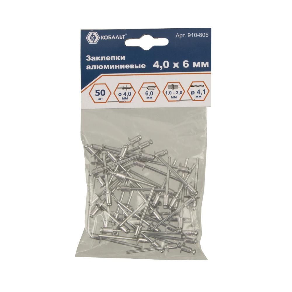 Заклепки вытяжные КОБАЛЬТ алюминиевые, 4,0 х 6 мм (50 шт.) пакет (910-805)