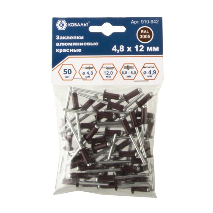 Заклепки вытяжные КОБАЛЬТ алюминиевые, 4,8 х 12 мм, красные RAL 3005 (50 шт. - цена, фото, технические характеристики