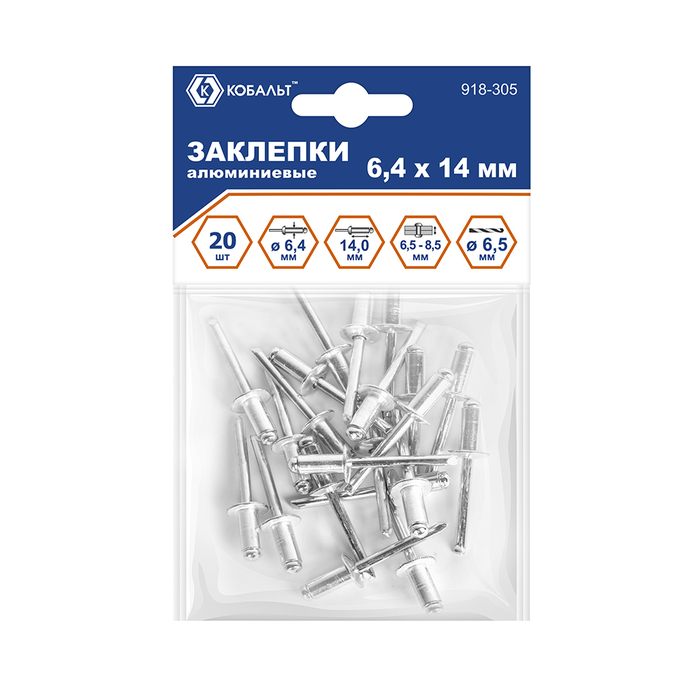 Заклепки вытяжные КОБАЛЬТ алюминиевые 6.4 х 14 мм, 20 шт., пакет с подвесом (918-305) - цена, фото, технические характеристики