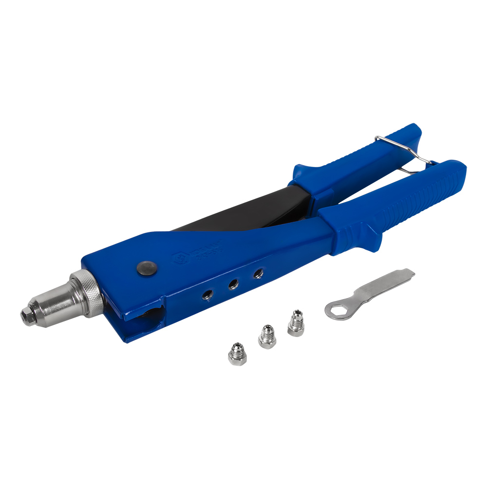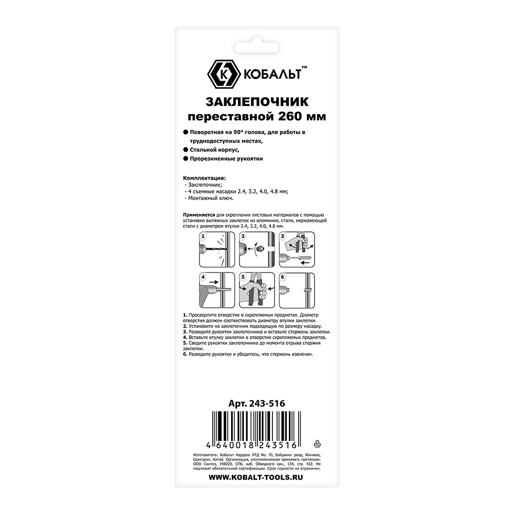 Заклепочник одноручный КОБАЛЬТ 260 мм, переставной 0-90 градусов, заклепки 2.4-3.2-4.0-4.8 мм, блистер (243-516) - цена, фото, технические характеристики