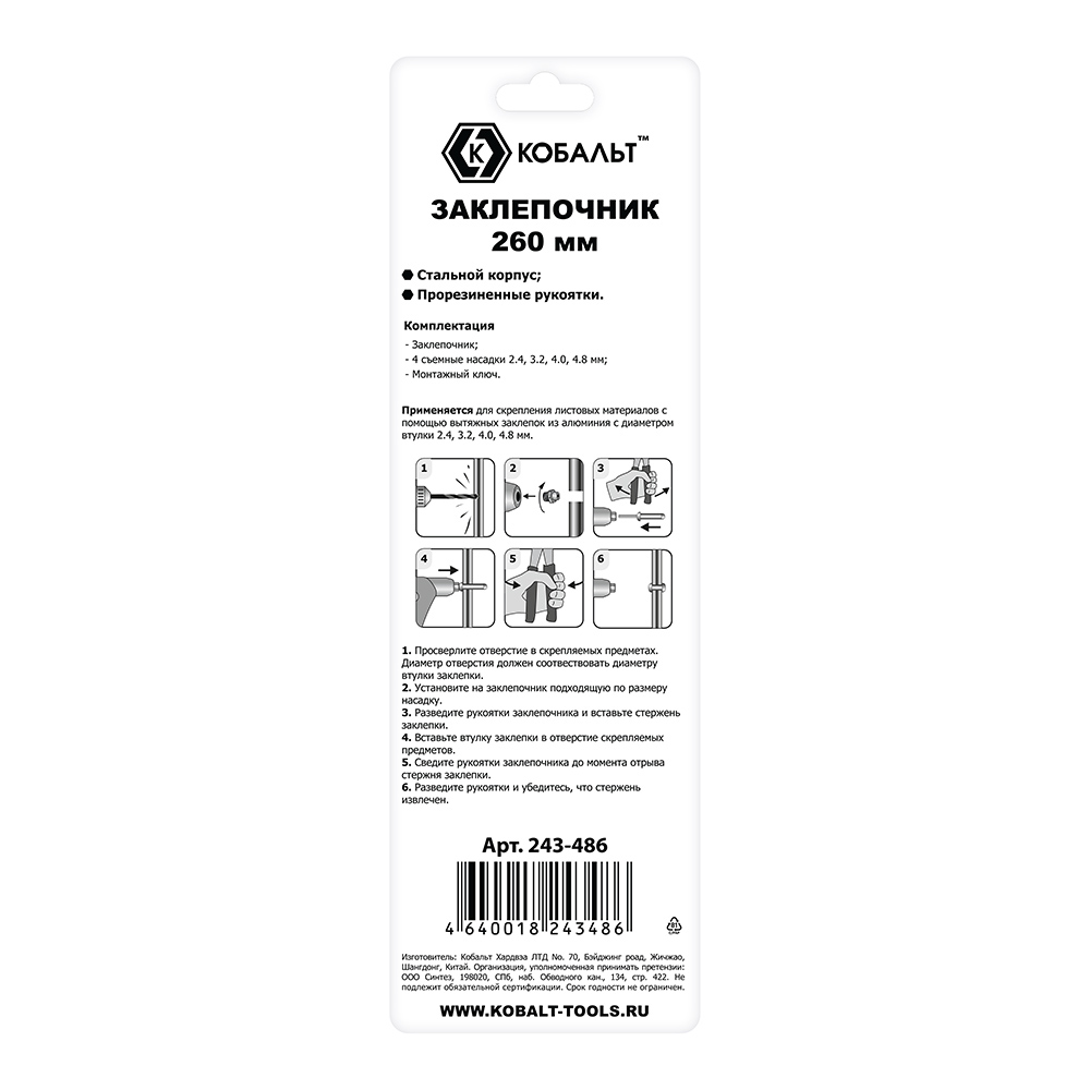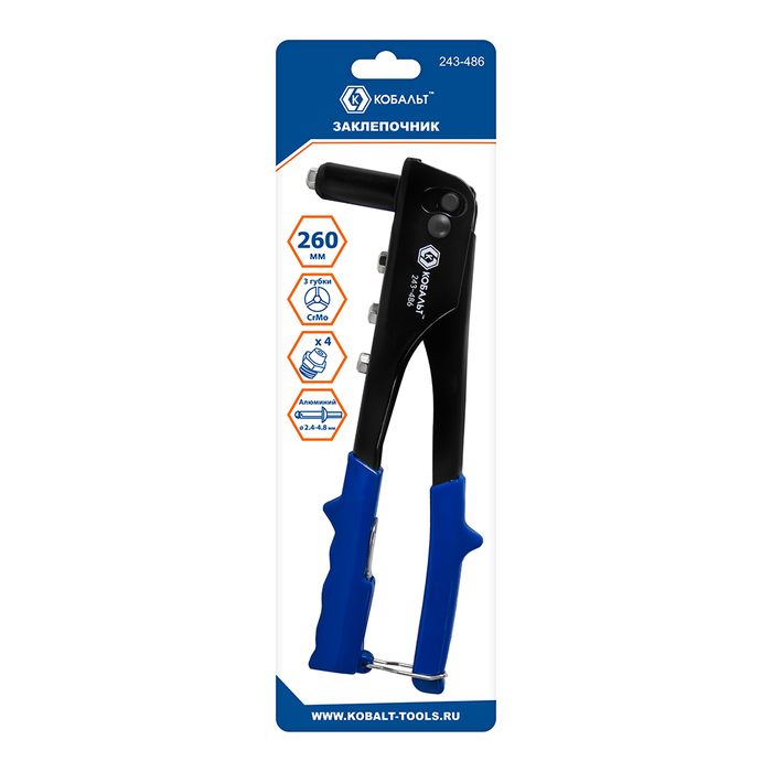 Заклепочник одноручный КОБАЛЬТ 260 мм, заклепки 2.4-3.2-4.0-4.8 мм, блистер (243-486) - цена, фото, технические характеристики