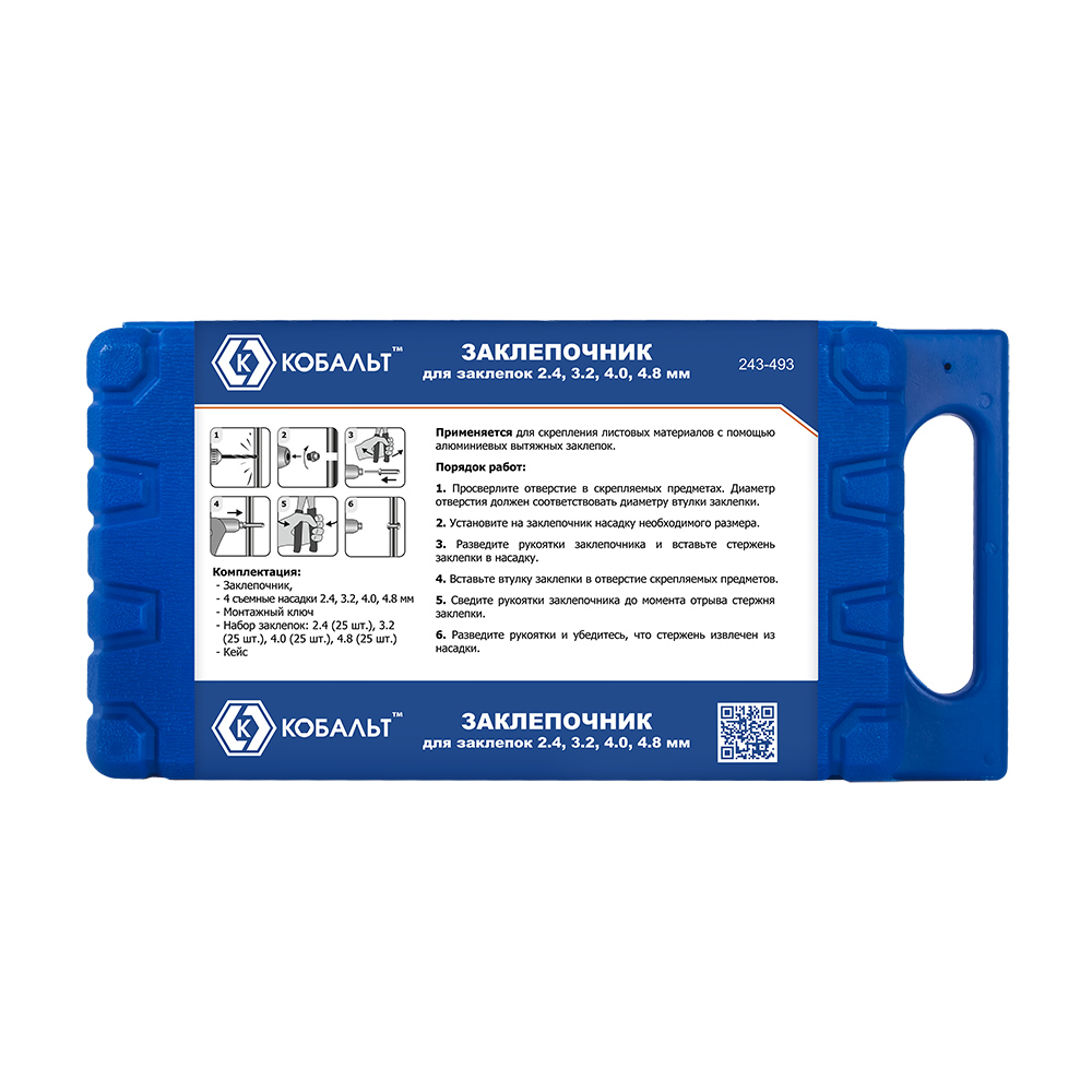 Заклепочник одноручный КОБАЛЬТ 260 мм, заклепки 2.4-3.2-4.0-4.8 мм, кейс (243-493) - цена, фото, технические характеристики