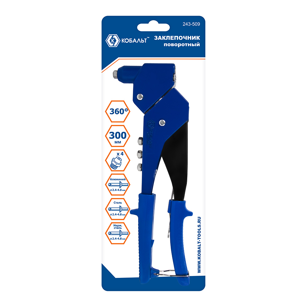 Заклепочник одноручный КОБАЛЬТ 300 мм, поворотный 0-360 градусов, заклепки 2.4-3.2-4.0-4.8 мм, блистер (243-509) - цена, фото, технические характеристики