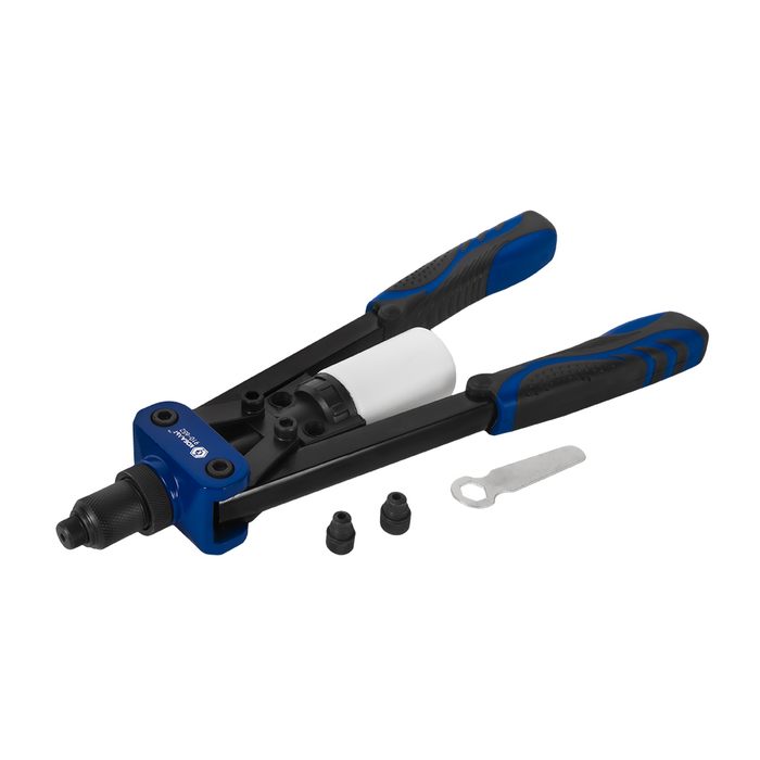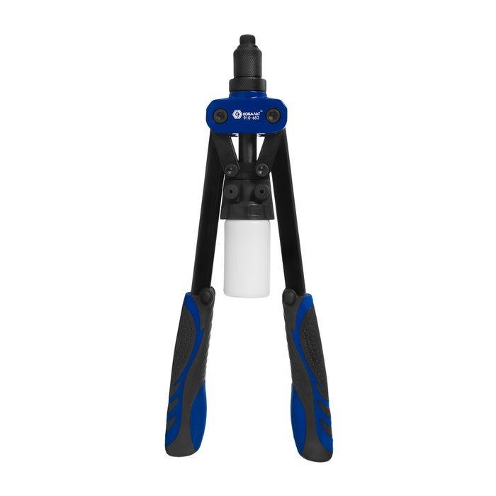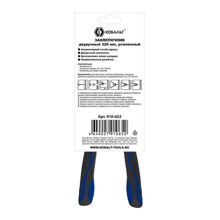 Заклепочник двуручный КОБАЛЬТ 320 мм, усиленный, заклепки 3.2-4.0-4.8 , контейнер для сбора стержней, блистер (910-652) - цена, фото, технические характеристики