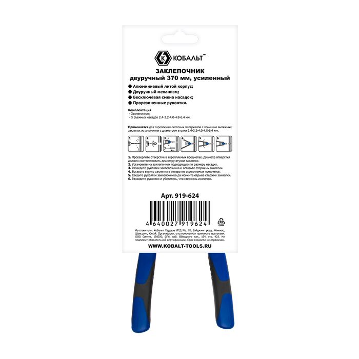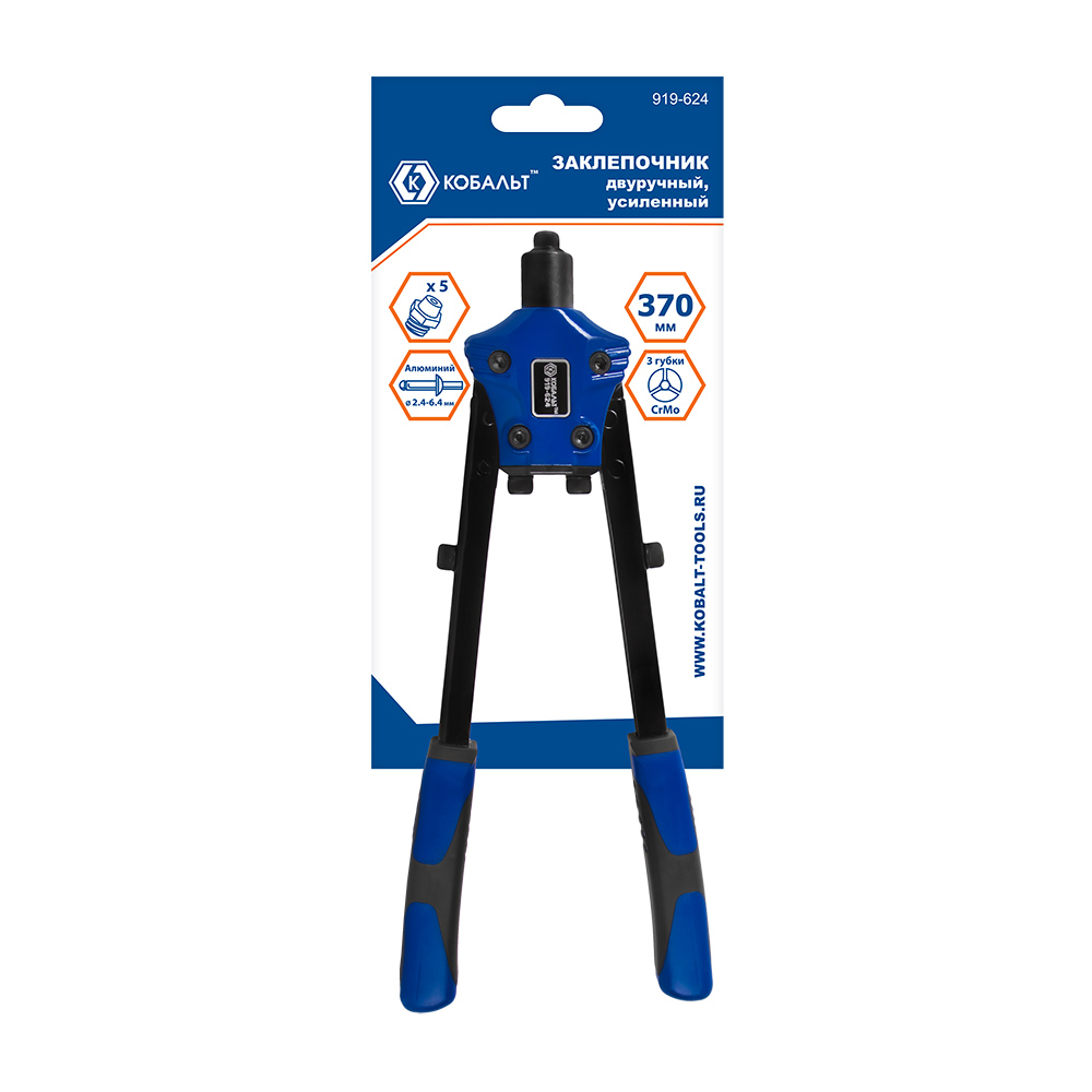 Заклепочник двуручный КОБАЛЬТ 370 мм, усиленный, заклепки 2.4-3.2-4.0-4.8-6.4 мм, блистер (919-624) - цена, фото, технические характеристики