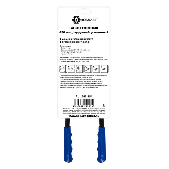 Заклепочник двуручный КОБАЛЬТ 450 мм, заклепки 2.4-3.2-4.0-4.8-6.4 мм, контейнер для сбора стержней, блистер (243-554)