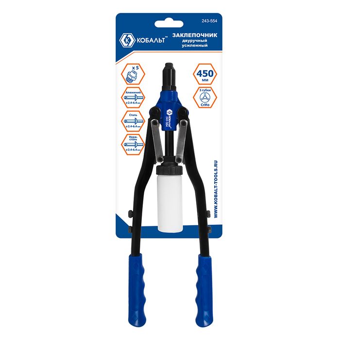Заклепочник двуручный КОБАЛЬТ 450 мм, заклепки 2.4-3.2-4.0-4.8-6.4 мм, контейнер для сбора стержней, блистер (243-554) - цена, фото, технические характеристики