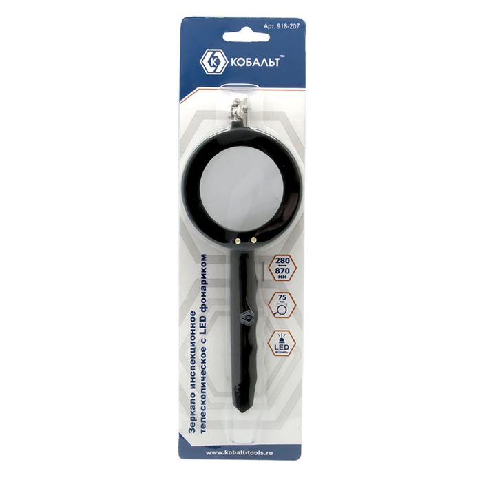 Зеркало инспекционное телескопическое КОБАЛЬТ 280 - 870 мм, диаметр 75 мм, LED-фонарь, блистер (918-207) - цена, фото, технические характеристики